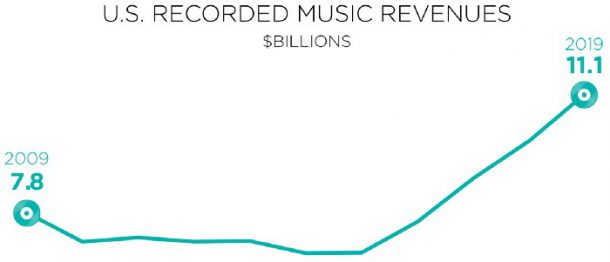 In USA 80% of music revenue came from streaming as the market grew, with 2019 streaming alone bigger than total market revenue in 2017.