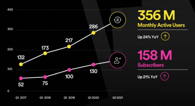 First a quick look at the recent trajectory, via this graphic from the latest Spotify press release. From 52 million subscribers in Q1 2017 to 158 million in 2021.