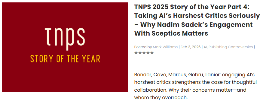But this aside is not quite as tangential as may first appear, because this ties in with the AI discussion. For the past eight-plus years TNPS has had pretty much no serious competition in Anglophone reportage and analysis of global publishing. Edward Nawotka makes a valiant effort (he was E-in-C of Publishing Perspectives in its glory days) but PW’s priority is the American market and what is of interest to American publishers. PW subscribers pay for the US focus, And Ed, bless him, has a PW editor and advertisers to answer to. (My worst nightmare!)